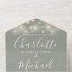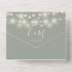 Le tout dans un faire-part de mariage avec de jolies lampes à cordes, des jarres de maçon, des noms de style signature et de la typographie chic sur un arrière - plan vert sage. L'invitation comprend une carte RSVP perforée avec un code QR. Conçu par Thisisnotme©