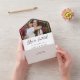 Photo tout en un faire-part de mariage avec des polices noires élégantes contre un arrière - plan blanc. Vous êtes invité est écrit en haut, sous une photo du couple heureux, et au-dessus d'un faire-part de mariage informel.