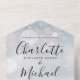 Le tout dans un faire-part de mariage avec un élégant nom de script signature et des initiales monogrammes sur un arrière - plan de flocons de neige en hiver. L'invitation comprend une carte RSVP perforée avec votre code QR du site Web mariage. Conçu par Thisisnotme©