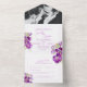 Mariage tout en une seule invitation avec un RSVP de base déchiré. Cette invitation de mariage présente un tableau d'aquarelle stock de fleurs violet botanique sur un arrière - plan blanc. Floral violet modèle de design de fleurs pour vous de personnaliser avec votre propre mariage, noms, détails une réponse de base avec une question diététique, et votre réponse de retour adresse pré-imprimée. Idéal pour les mariages de jardin ou de fleurs violettes. Cette conception ne nécessite aucune enveloppe supplémentaire et dispose d'un RSVP perforé détachable pour des réponses et des rouleaux faciles à envoyer afin que vous puissiez envoyer votre adresse à la main sur l'avant de l'invitation. Produits mariages correspondants et autres options de couleur disponibles dans le magasin. © Art botanique et design aquarellé peint à la main par Sarah Trett pour www.mylittleedenweddings.com