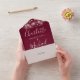 Le tout dans un faire-part de mariage avec de jolies lampes à cordes et un élégant nom de script signature et des initiales monogrammes sur un arrière - plan bordeaux. L'invitation comprend une carte RSVP perforée avec votre code QR du site Web mariage et des détails. Conçu par Thisisnotme©