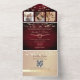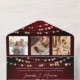 Dans cette faire-part de mariage tout-en-un, vous serez séduit par l'élégance rustique et le charme moderne de votre hôtel. Situé sur un riche arrière - plan en bois bordeaux, le design dégage une élégance et une chaleur intemporelles. Des lumières à cordes délicates et un coeur de cordes d'or romantique ajoutent une touche magique, tandis que quatre emplacements photo personnalisés vous permettent de présenter l'histoire d'amour qui vous a amené ici. Avec des détails mariages intégrés, un code QR scannable et un lien vers votre site mariage, cette invitation est aussi pratique que belle - idéale pour les mariages d'automne, d'hiver ou de thème rustique. Remarque : Cette invitation tout-en-un nécessite une enveloppe distincte pour l'envoi. Nous vous recommandons de l'apparier avec une enveloppe A9 standard (5,75 po x 8,75 po) pour un meilleur ajustement.
