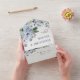 Élégante invitation à un mariage d'hiver fleuri et fleuri avec un bouquet de fleurs gris et bleu glacé et une végétation ondulée. Veuillez me contacter pour toute aide sur la personnalisation ou si vous avez besoin d'un autre produit avec ce design.