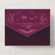 invitación con elegante textura de color cereza degradado y foto de pareja y palomas con anillos y brillo con el texto dorado para una simple boda.