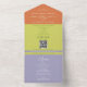 The invitation includes a QR code for easy RSVP, a wedding website link, and a coordinated striped envelope-style fold that adds a polished, contemporary touch. Fresh citrus tones, bold purple accents, and a radiant gold rope-heart motif make this suite perfect for couples planning a vibrant spring, summer, or outdoor celebration.
