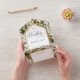 DISPONIBLE AVEC OU SANS CODE QR OU OPTIONS DE SÉLECTION DE DÎNER. Ce design présente un arrière - plan de différents types de verdure botanique. La zone de texte blanche est encadrée de faux papier doré. Un monogramme avec la première initiale de la mariée et du marié sur le rabat extérieur le complète. Créé par Simply Farmhouse Press.