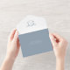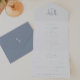 Elégante verdure ornée de crête, mariage le tout dans une seule invitation. Mariage monogramme moderne et intemporel crête en bleu poussiéreux avec modèle de typographie minimaliste tendance.