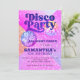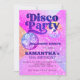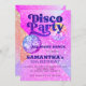 Invitation du Disco Ball Party des années 70 rétro avec des boules rose et violet brillantes sur un arrière - plan de la galerie. +++++++++++ Convient pour une fête d'anniversaire moderne et branchée.