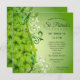 Cartes d'invitation fantaisie pour la Saint-Patrick avec beaucoup de trèfles et de volutes blanches et vertes sur un fond dégradé vert.