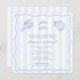Modern hand-drawn Seafood Boil co-ed bridal shower or engagement party invite card design featuring original doodle style illustration elements. Shown here in blue and white blue please note ALL colors of all elements can be customized (stripes, background, crustaceans, border). All artwork in this invitation collection is my own original work (hand drawn and / or hand painted).