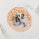 Designed to fit the circle die-cut, this trendy holiday card features the message "Happy New Year" in a modern, handwritten font that wraps around the circle photo frame. Hand-drawn stars and dots add a festive, whimsical touch to the design. The back of the card features a coordinating pattern. This design is perfect for kids and teens!