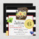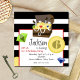Une invitation à l'anniversaire sur le thème des pirates avec un arrière - plan rayé noir et blanc. Illustration d'un coffre au trésor rempli de pièces d'or, perles, épées et bijoux rouges, verts et bleus en haut. Pièces et bijoux éparpillés sur invitation. Personnalisez le texte et le numéro de la pièce.