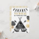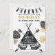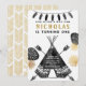 Moderne, simple et audacieuse cette conception est parfaite pour la fête d'anniversaire de votre petit aventurier. Teepee, flèches, plumes, et feuille tirés par la main avec de l'or et le lettrage noir. Perfectionnez pour votre sauvage !