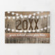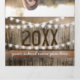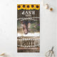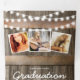 Une invitation trifold de fête de diplômé rustique de campagne 2 en 1 avec un fond de tonneau en bois rustique, des guirlandes lumineuses, des tournesols jaunes vifs, des photos du diplômé, l'année de la promotion, les détails de la célébration de la remise des diplômes et une carte postale de RSVP que vos invités peuvent détacher et renvoyer.