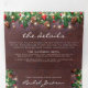 Invitation pliable 3 en 1 pour mariage d'hiver rustique avec un fond en bois sombre, branches d'arbre de Noël festives, décorations d'arbre rouges et dorées, guirlandes lumineuses, vos informations de mariage, une invitation de mariage et une carte de réponse RSVP que vos invités peuvent détacher et renvoyer.