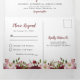 Tout en un carton d'invitation triptyque rustique de mariage floral avec un fond blanc simple, des fleurs aquarelles élégantes rose et burgundy, détails du mariage, invitation de mariage et une carte-réponse RSVP pour vos invités à détacher et renvoyer.