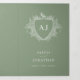 Elegant classic traditional French Victorian sage green toile de jouy chinoiserie style crest monogrammed charming all in one wedding trifold invitation with guest information details and QR code (automatically generated with your web address) to RSVP online.