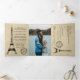 Cette invitation de mariage pliée en trois est parfaite pour votre jour spécial. Elle comprend non seulement votre invitation pour vos invités, mais aussi une section pour les détails de votre mariage, une réponse RSVP, y compris un choix de sélection de menu et une section pour une belle image du couple heureux. Dans la section de personnalisation, vous pourrez recadrer votre photo et l'ajuster pour obtenir un ajustement parfait, changer les couleurs et le style des polices et personnaliser l'arrière-plan.