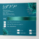 Une belle décoration luxueuse et glamour tout-en-un avec une jolie robe en pierre de rhinocéros turquoise dressée contre un arrière - plan bleu turquoise foncé infusé de fleurs roses florales délicates et de bords d'angle argentés. Le tiers inférieur a une carte de réponse déchirante avec adresse rsvp personnalisée et options de repas à compléter pour vos invités. Elles sont idéales pour une quinceanera; douche nuptiale; tout anniversaire d'âge ou un événement spécial pour célébrer la femme. Personnalisez le libellé, la couleur arrière - plan et ajoutez votre propre photo pour le rendre unique.