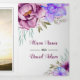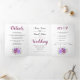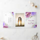 Fleurs aquarelle violettes photo florale mariage Invitation pliable triptyque avec carte de réponse détachée. Un beau design de mariage qui comprend des fleurs aquarelles dans des tons de violet et de bleu et des feuilles. Les noms sont en typographie script. Découpez le dernier panneau intérieur et utilisez-le comme carte de réponse. Le panneau arrière extérieur comprend une photo du couple.