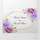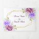 Fleurs aquarelles bleues et violettes dans un cadre doré, invitation de mariage avec carte-réponse détachable. Un beau design de mariage qui met en valeur un cadre polygonal doré avec vos noms en typographie violette et un bouquet de fleurs aquarelles violettes et bleues avec des feuilles sur la couverture, vos coordonnées sur le premier panneau intérieur, vos informations de mariage sur le panneau intérieur central et votre RSVP sur le dernier panneau intérieur. Le dos extérieur présente votre photo avec vos initiales.