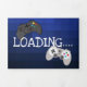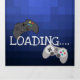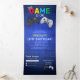 Cool 2 en 1 invitation d'anniversaire avec un arrière - plan pixel bleu, le texte "LE JEU EST SUR !", deux contrôleurs de jeu vidéo, une photo de votre enfant, une invitation de fête, et une carte postale rsvp.