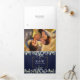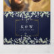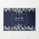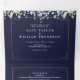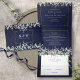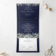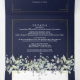 Tout en un carton d'invitation de mariage bleu marine triptyque avec feuillage de sauge et de lilas, une typographie élégante et votre photo spéciale. L'invitation comprend les détails d'information pour les invités à la célébration et une carte RSVP détachable. Conçu par Thisisnotme
