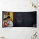 Triple faire-part de mariage vous pouvez personnaliser avec deux photos, votre site mariage, et vos dates spéciales. La faire-part de mariage pliée est composée de verdure dans une palette de couleurs profondes, parfaite pour un mariage mariage de automne ou hivernal avec des feuilles, des brindilles et des baies en bleu, bordeaux et vert olive contre un arrière - plan sombre.