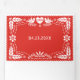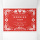 Pape rouge picado inséparables triple invitation de la fête mariage . Cette nature inspiré art populaire mexicain style mariage floral invite présente deux inséparables blancs et un coeur d'amour avec le mot amour ainsi que des fleurs, feuilles et petits points sur rouge.