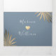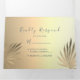 Simple, moderne, tropical, invitation de mariage de plage en bleu poussiéreux d'été 3 en 1 pliable, avec feuilles de palmier dorées et photo des mariés.