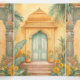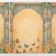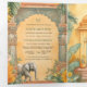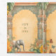 Étonnez vos invités avec cette élégante invitation de mariage sur le thème sud-indien, avec de belles colonnes traditionnelles et des éléments architecturaux vintage ornés de fleurs de souci et de feuilles de bananier.