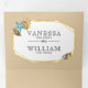 Polygone de feuille d'or et coquillages plage de sable d'été couleur mariage triple invitation. Il affiche un cadre polygonal doré avec votre texte et trois coquillages d'aquarelle en beige et bleu dans le coin supérieur gauche et un autre en bas droit sur le couvercle et le premier panneau intérieur sur arrière - plan couleur sable. Le panneau du milieu est de couleur bleu uni tandis que le panneau dernier présente le même cadre avec des coquillages. Il y a une photo du couple au dos et la date de la date sur le rabat.