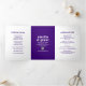 Invitations de mariage triplées de style moderne avec une disposition simple et minimale avec vos noms dans une police rétro super. Vous trouverez ci-dessous les détails de votre événement dans une police sans serif avec votre code QR (facultatif) pour que les invités puissent scanner et facilement RSVP en ligne. Le panneau de gauche a votre programme d'événements, le panneau de droite a vos détails supplémentaires et le fond a votre photo préférée. Les couleurs vives sont colorées de joyaux toniques royal violet. Le code QR peut être supprimé et les polices / couleurs peuvent être modifiées dans l'outil d'édition de conception.