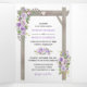 Une invitation triplée tout en un mariage à fleurs rustique avec un arrière - plan blanc chic qui peut être changée en n'importe quelle couleur, un élégant violet & lavande aquarelle fleurie sur une arbor mariage en bois rustique, un coeur sculpté avec les initiales des couples, les détails mariages, invitation de mariage, et un rsvp pour vos invités à couper et renvoyer.