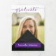 Un script élégant annonce votre diplômé sur votre photo préférée de senior sur le devant. Bloc pour leur nom sur le devant, et tous les détails de la cérémonie à l'intérieur avec deux autres photos. Espace au dos pour un message de remerciement aux amis et à la famille. Conception disponible dans les couleurs de l'école rouge, orange, violet, vert, bleu, orange brûlé, bordeaux et noir. Produits assortis disponibles.