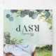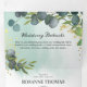 Invitation de mariage triple volets en feuillage botanique tout-en-un avec un fond rustique délavé à l'aquarelle, des feuilles d'eucalyptus bleu élégantes, des éclaboussures de faux foil doré, vos initiales, les détails du mariage, l'invitation et une carte de réponse pour vos invités à découper et à renvoyer.