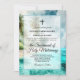 This beautiful wedding invitation features a watercolor background of pristine tropical beach with turquoise waters and palm trees. The design is simple, traditional and elegant, with formal wording for a catholic ceremony with the guests being invited to a nuptial mass uniting the couple in the sacrament of holy matrimony. There is a cross or crucifix at the top, fancy script lettering. Beautiful way to invite your friends and family to be a part of your special day. Perfect for a coastal or island destination wedding.