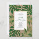 Invitation de mariage en papier kraft feuille vert et or tropical. Il présente des feuilles de Fromage Leaf Philodendron (Monstera deliciosa) ou de Fromage Suisse Plante et feuilles de palme en vert avec contour or sur papier kraft. Votre libellé est dans un cadre blanc avec contour doré. L'arrière comprend un motif à points de polka doré.