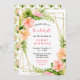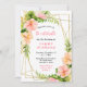 This fun and whimsical birthday party invitation features watercolor pink and orange hibiscus flowers, monstera leaves and foliage on a gold geometric frame. The text combines handwritten script and serif fonts for a stylish and modern look. This is perfect for a spring or summer rustic birthday party.