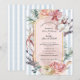 Invite your guests in beautiful tropical style with this tropical orchid arch wedding invitation. Featuring elegant watercolor orchids, soft blush roses, and lush tropical greenery, this design creates a romantic botanical frame around your wedding details. The delicate gold arch border highlights the text while the subtle blue striped background adds a refined coastal destination wedding feel.