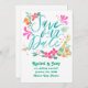 Cette carte de "Save the Date" présente un design aquarelle vibrant et ludique. Le texte écrit à la main est en teal gras, entouré d'éléments festifs tels que des fleurs roses vives, des fruits orange, une bouteille de champagne et un verre à cocktail, le tout peint dans des couleurs vives. Les accents floraux et tropicaux, combinés à l'imagerie de célébration, donnent à cette carte une ambiance amusante et joyeuse - parfaite pour les couples qui prévoient une célébration de mariage animée et rythmée.