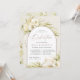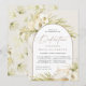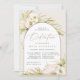 Les invitations chic et tropicales à l'accouchement dans une palette de couleurs neutres séduisantes comprennent un élément central voûté portant les détails de la cérémonie et de la fête de l'église, accentué de frondes de palmier vert pâle, de feuillage de l'île de la plage, d'orchidées blanches, de botaniques secs et de pampas.