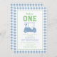 Thème de golf de premier anniversaire "Trou en un" avec chariot or et motif plaid bleu à damiers clair.