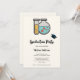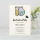 Invitation de fin d'études avec une illustration mignonne d'un tube à essai contenant du liquide jaune et une fiole/coupelle arrondie contenant du liquide vert avec des bulles rouges.
