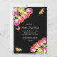 Fête des Mères : invitation à brunch pour tulipes roses et papillons. Le design présente des bouquets colorés de tulipes rose, jaune et orange sur un arrière - plan noir. Les papillons roses et jaunes flottent joyeusement autour des tulipes, rehaussant l'esthétique joyeuse avec une touche de fantaisie ! Le fond de l'invitation est décoré d'un motif de printemps de tulipes et papillons. Personnalisez le texte et changez le style et la couleur de police pour convenir à votre propre célébration spéciale.