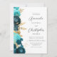 Le bord gauche de cette élégante faire-part de mariage moderne est orné d'une bordure turquoise bleue et d'une bordure de fleurs d'aqua bordée d'un feuillage en faux feuille d'or. Le texte personnalisable combine le script gris charbon et les polices sans serif sur un arrière - plan blanc. L'envers offre de l'espace pour les détails du mariage, ainsi qu'un code QR que les clients peuvent scanner pour visiter votre site Web et RSVP, ce qui permet d'économiser le coût d'impression et d'envoi de cartes RSVP séparées.