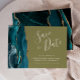 Cette élégante carte de date moderne comporte une bordure d'aquarelle bleue turquoise, découpée avec une parties scintillant en faux or. Le texte personnalisable combine écriture manuscrite en ivoire, copperplate et polices italiques sur un arrière - plan vert olive. L'envers présente un design d'agate turquoise et or assorti.