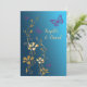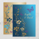 Ce faire-part de mariage floral bleu et or turquoise a des papillons violets et des zones de texte personnalisables. Le choix du texte et du papier est personnalisable. Si vous avez besoin d'articles correspondants dans cette conception, veuillez envoyer votre demande par courriel à niteowlstudio@gmail.com. Des frais de conception peuvent s'appliquer.