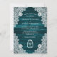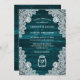 Faire-part de mariage turquoise rustique avec bocal de maçon et dentelle blanche fleurie sur un arrière - plan en bois rustique. Personnalisez facilement ce faire-part de mariage turquoise pour compléter votre pays rustique, ou fête de mariage de grange.