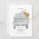 Faire-part de mariage à cou rouge. Bottes de cowboy et casquette. Chaîne de lumières. Fleurs de soleil. Arrière - plan Turquoise clair. Camion vintage.
